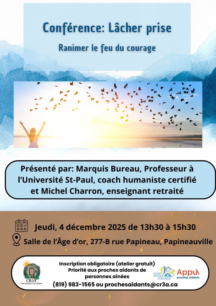 Le Comité régional Troisième Âge Papineau a le plaisir de vous inviter à assister à la conférence « Le lâcher-prise », présentée le jeudi 4 décembre 2025, de 13 h 30 à 15 h 30, à la Salle de l’Âge d’or, située au 277-B, rue Papineau, à Papineauville.